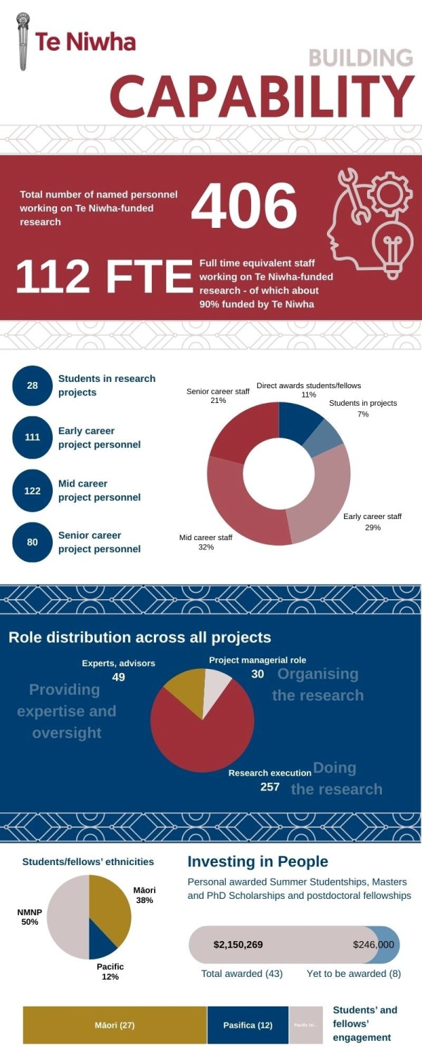 Building capability in infectious diseases research is at the core of Te Niwha’s mission. The infographic below provides a glimpse into some numbers around the workforce behind the research funded by Te Niwha.